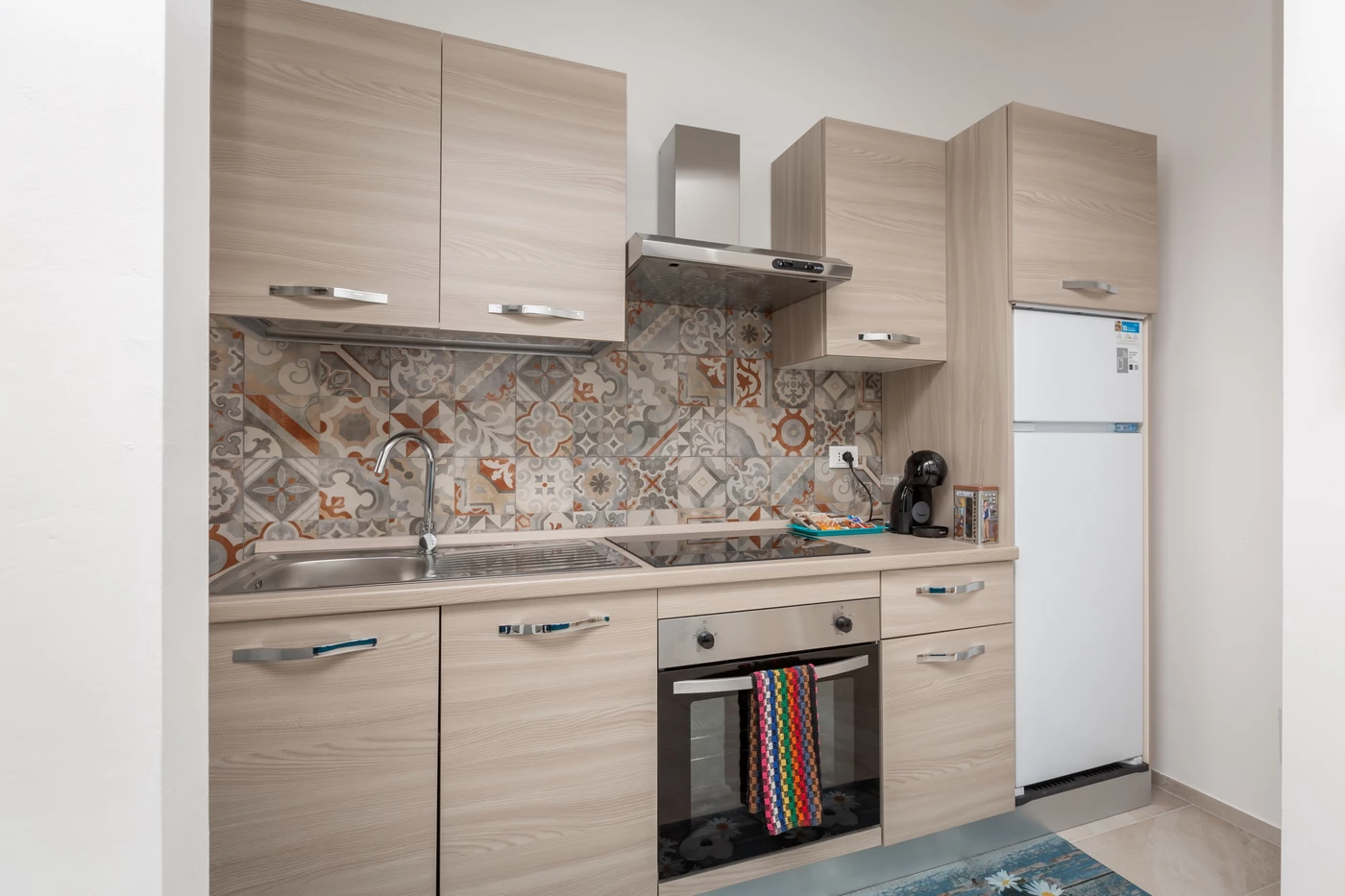 Cucina attrezzata con stoviglie, pentole, macchinetta per il caffè e bollitore.